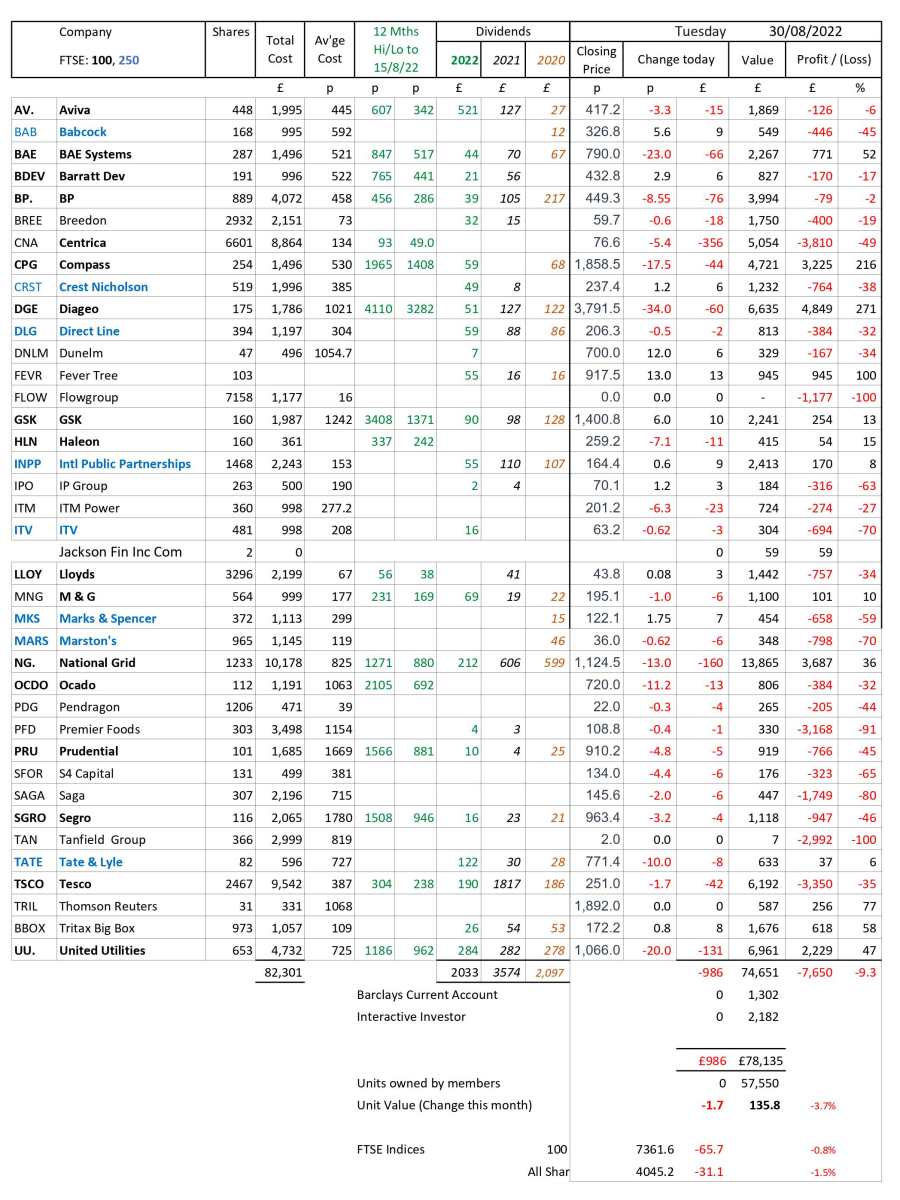 as at close of business Tuesday 30 August 2022