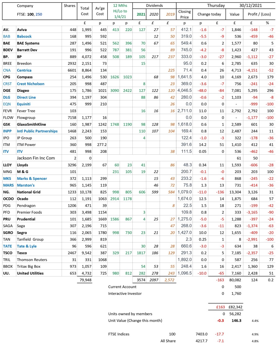 as at close of business Thursday 30 December 2021