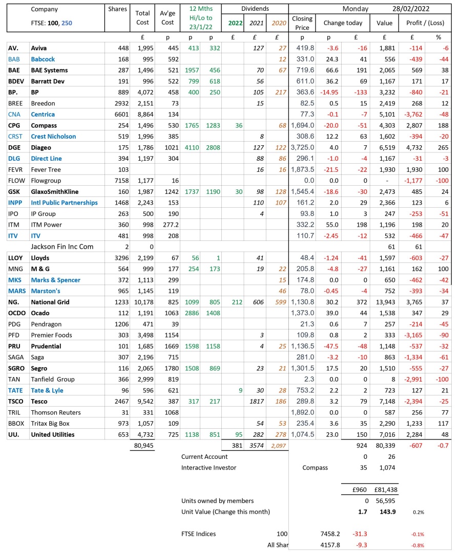 as at close of business Monday 28 February 2022