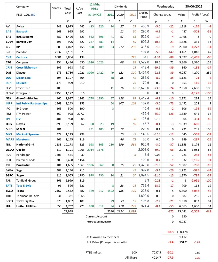 as at close of business Wednesday 30 June 2021