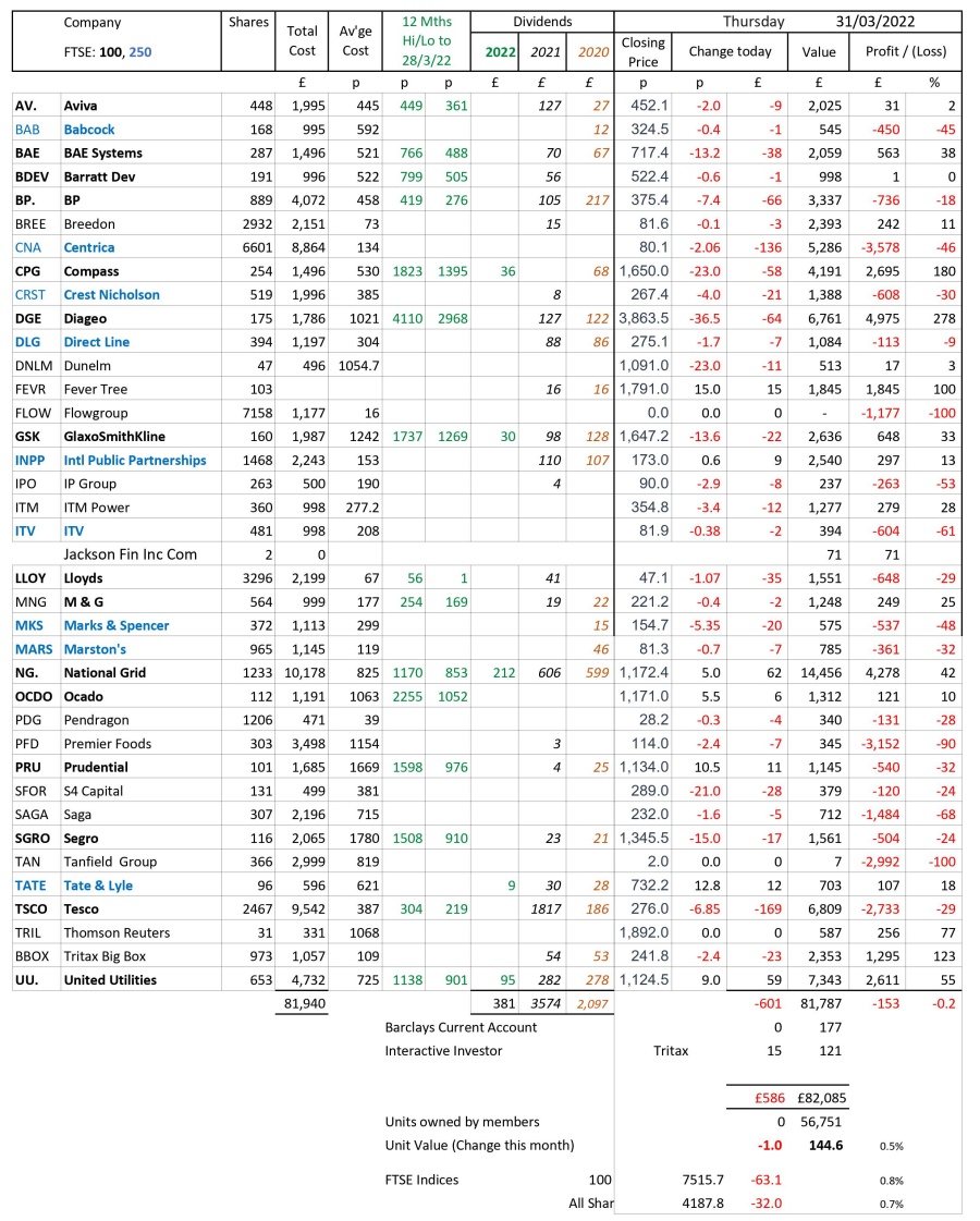 as at close of business Thursday 31 March 2022