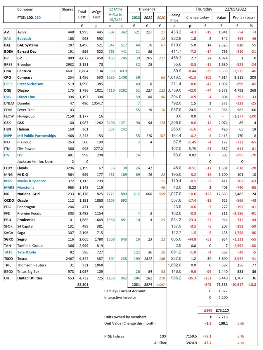 as at close of business Thursday 22 September 2022